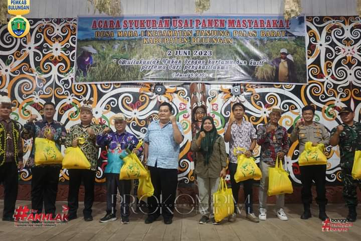Kaltaraa1.com bulungan-Bertempat di balai adat, segenap unsur masyarakat dan pemerintah Desa Mara I di Kecamatan Tanjung Palas Barat menggelar syukuran usai panen pada Jumat (2/6). Asisten Perekonomian dan Pembangunan, Errin Wiranda, SE mewakili Bupati Bulungan menyampaikan selamat dan mengingatkan hasil panen agar disisihkan bagi warga kurang mampu.