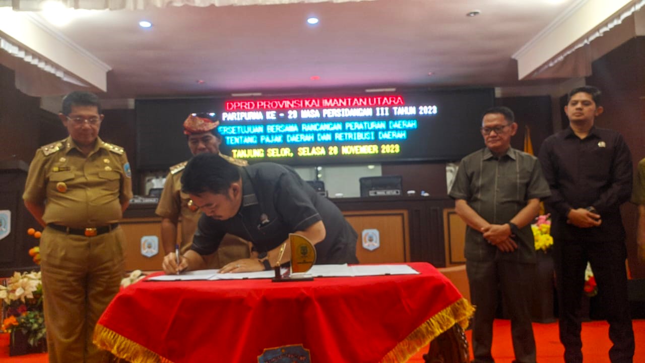 Kaltaraa1.comTANJUNG SELOR – Dewan Perwakilan Rakyat Daerah (DPRD) Provinsi Kalimantan Utara, melaksanakan Rapat Paripurna ke-29 Masa Persidangan III Tahun 2023 dengan agenda Persetujuan Bersama Rancangan Peraturan Daerah tentang Pajak Daerah dan Retribusi Daerah, Selasa (28/11).